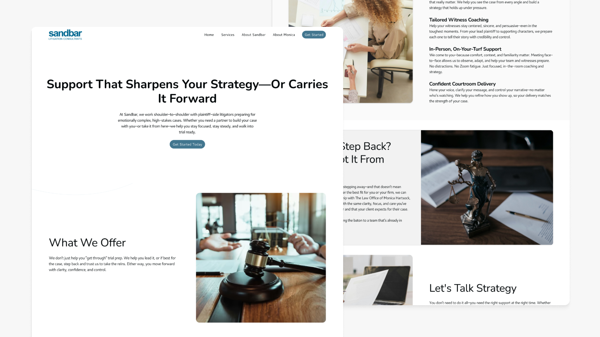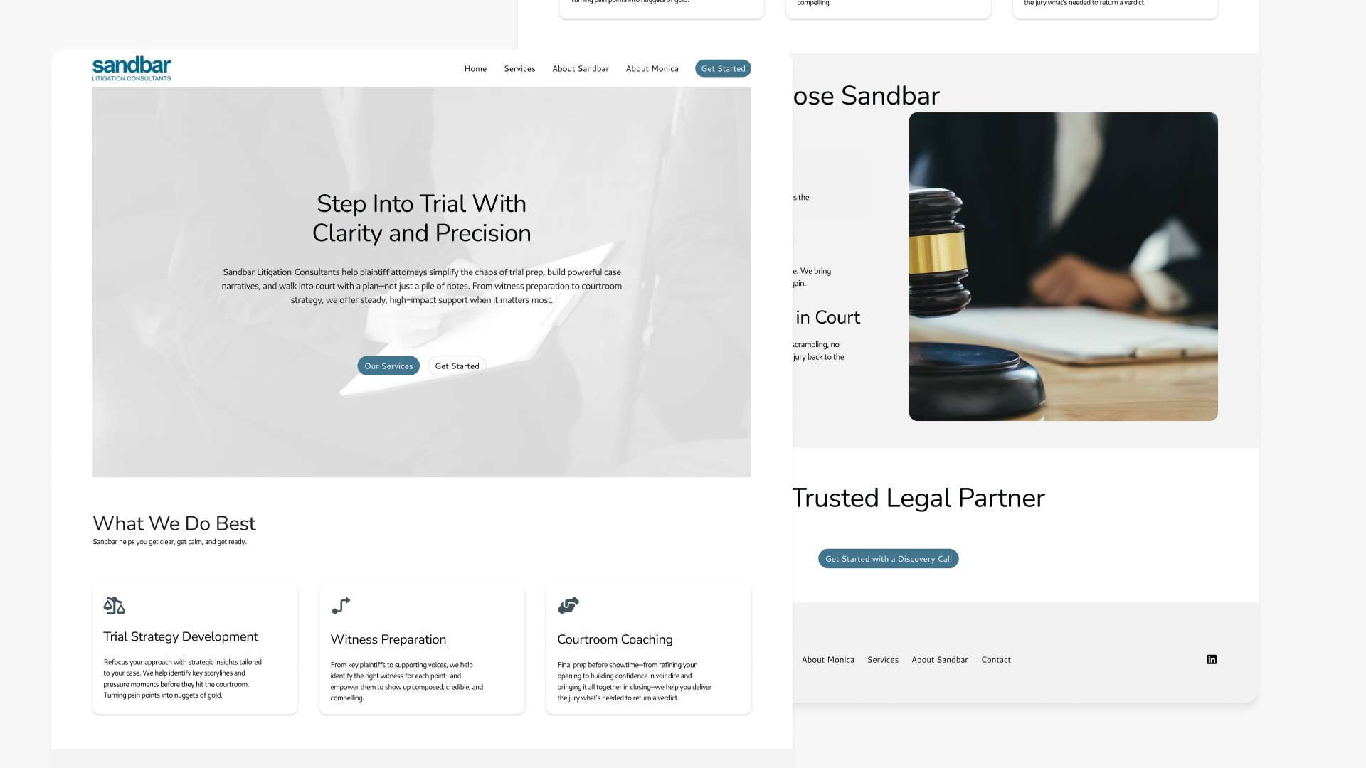 We partnered with Sandbar to refine their messaging and design a website that conveys professionalism without losing approachability. The new site highlights their services—trial strategy, witness preparation, and courtroom coaching—while framing Sandbar as the trusted partner who helps attorneys bring order and focus to complex cases.